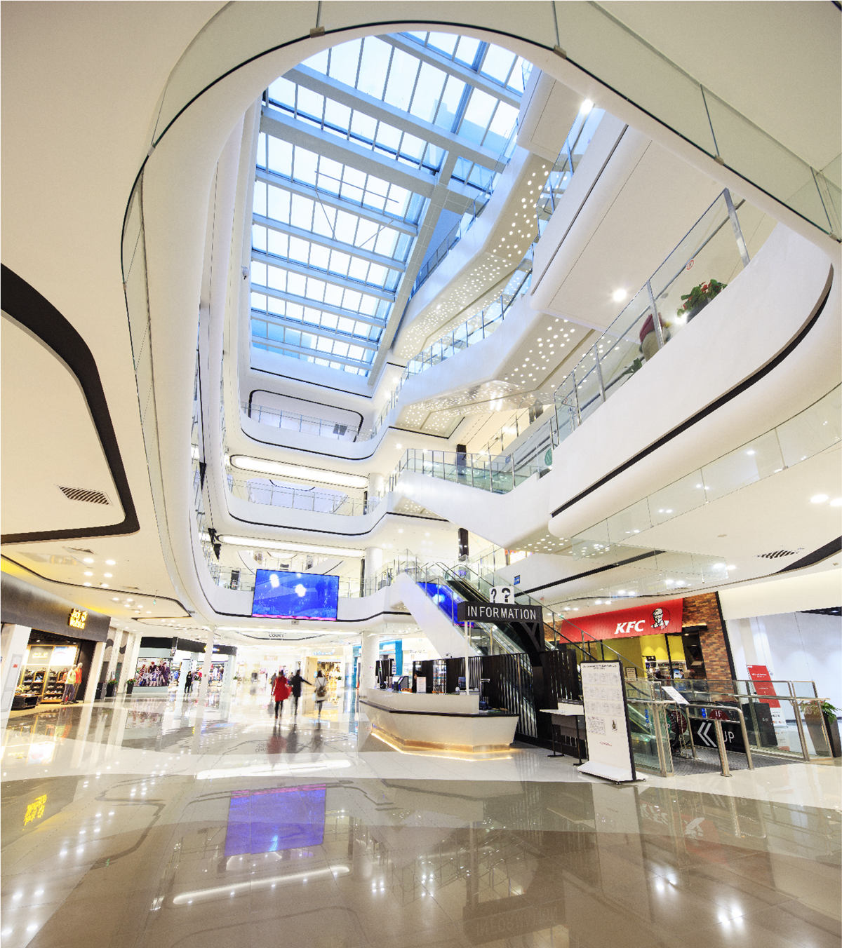 本项目为郊区型商业购物中心,提供餐饮、购物、休闲、娱乐一站式服务。整个建筑简约、精致,采用大尺度造型设计,整体感强。平面功能布局遵循“两核一街”经营理念。即在购物中心两侧配备两个以上的主力店,中间由一条专卖店街道连接。
